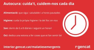 Proteccio Civil posa en marxa una pàgina web amb recomanacions, pautes i consells per a la situació de confinament. http://interior.gencat.cat/autocura L’apartat #Autocura ofereix recomanacions pràctiques per tal que les persones adoptin rutines i dinàmiques saludables en els diferents aspectes del ...